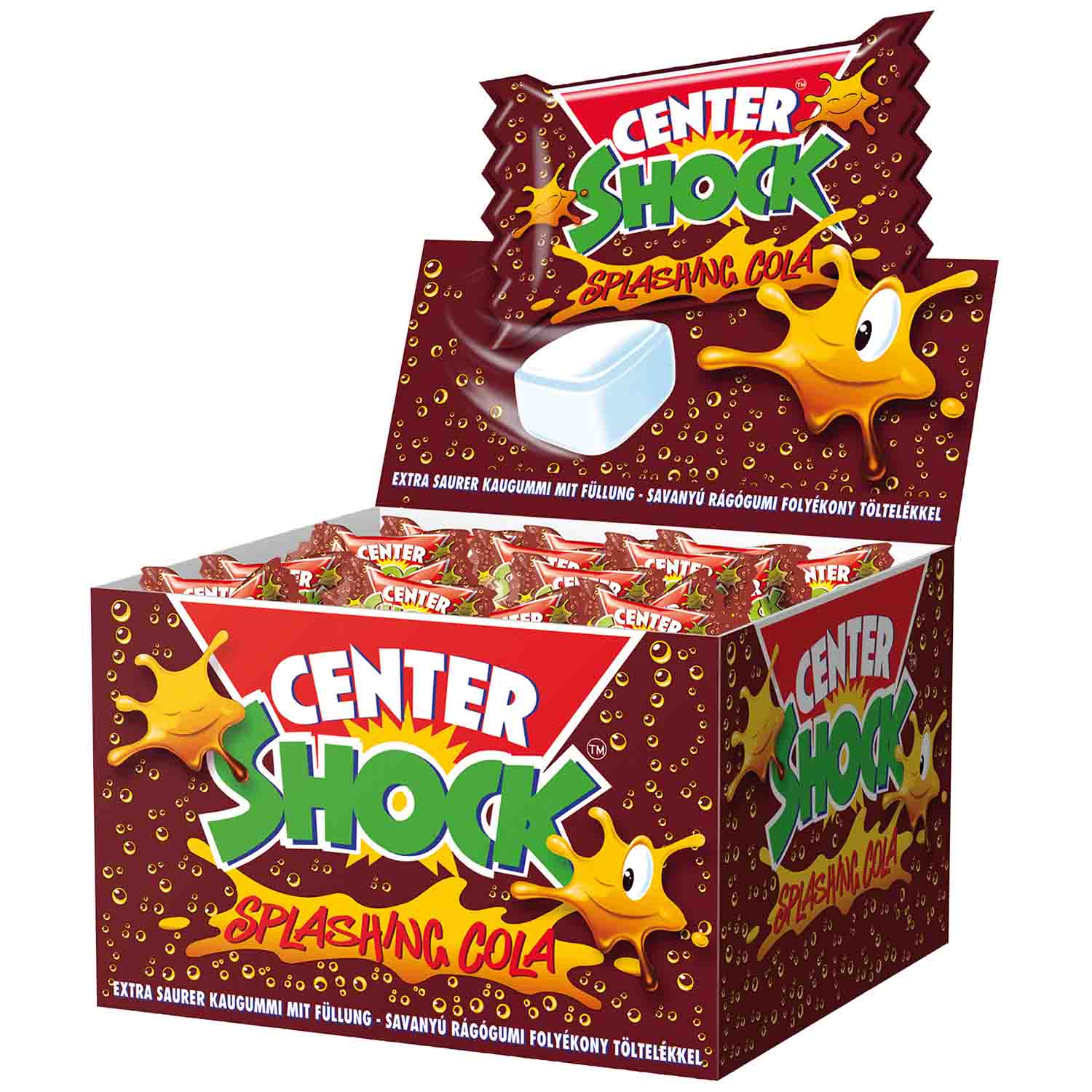 Center Shock Splashing Cola sorgt für den bekannten, extrem sauren «Shock-Effekt», den viele noch aus ihrer Kindheit kennen. Aussen süss und fruchtig nach Cola, innen mit einem extra sauren Flüssigkern, der für die typische Überraschung sorgt. Die Kaubonbons sind einzeln verpackt und eignen sich perfekt zum Verteilen.